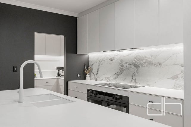 A steel-arch door introduces the expansive open-plan living space, where Arabescato Vagli marble pairs seamlessly with white porcelain benchtops. The award-winning kitchen, enhanced by LED strip lighting, is supported by a butler's pantry and features a suite of matte black AEG appliances, delivering a premium cooking experience.