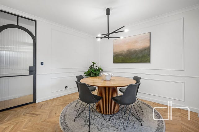 Flooded with natural light, the open-plan living and dining zone is defined by statement lighting and picture-frame wall mouldings, flowing effortlessly to the outdoor entertaining area. Here, honed aggregate flooring meets a polished concrete outdoor kitchen, featuring an integrated Weber barbecue and Gozney pizza oven. Synthetic lawn ensures low-maintenance appeal, while built-in bench seating accommodates both intimate dinners and larger gatherings.