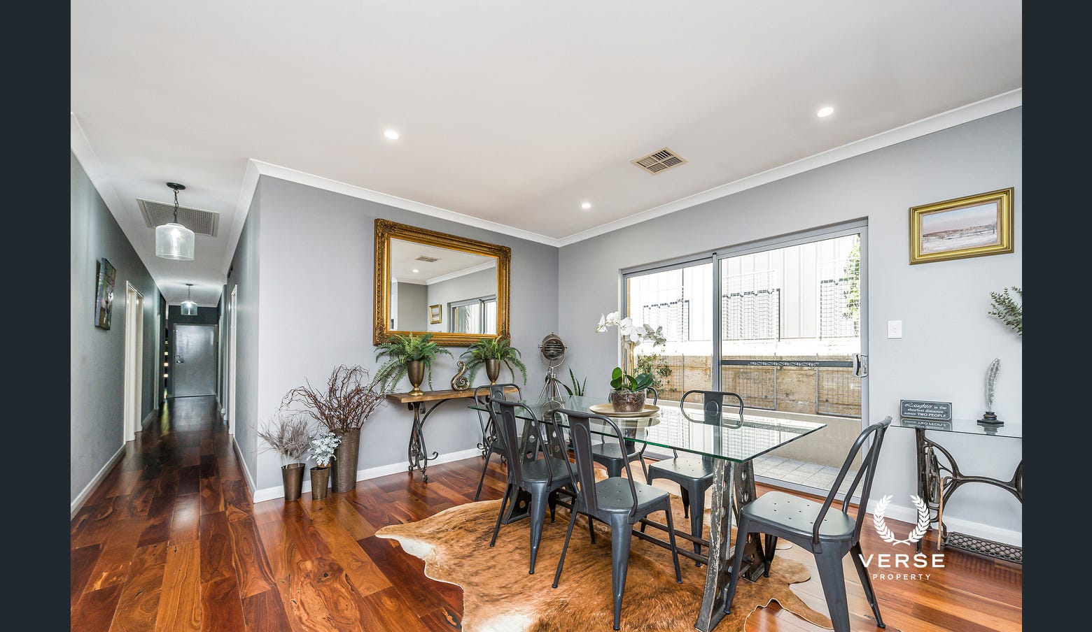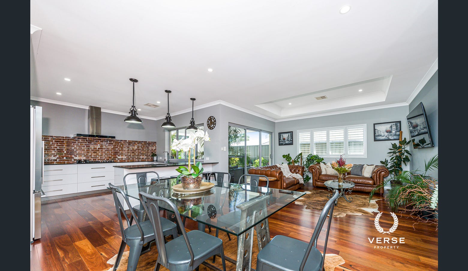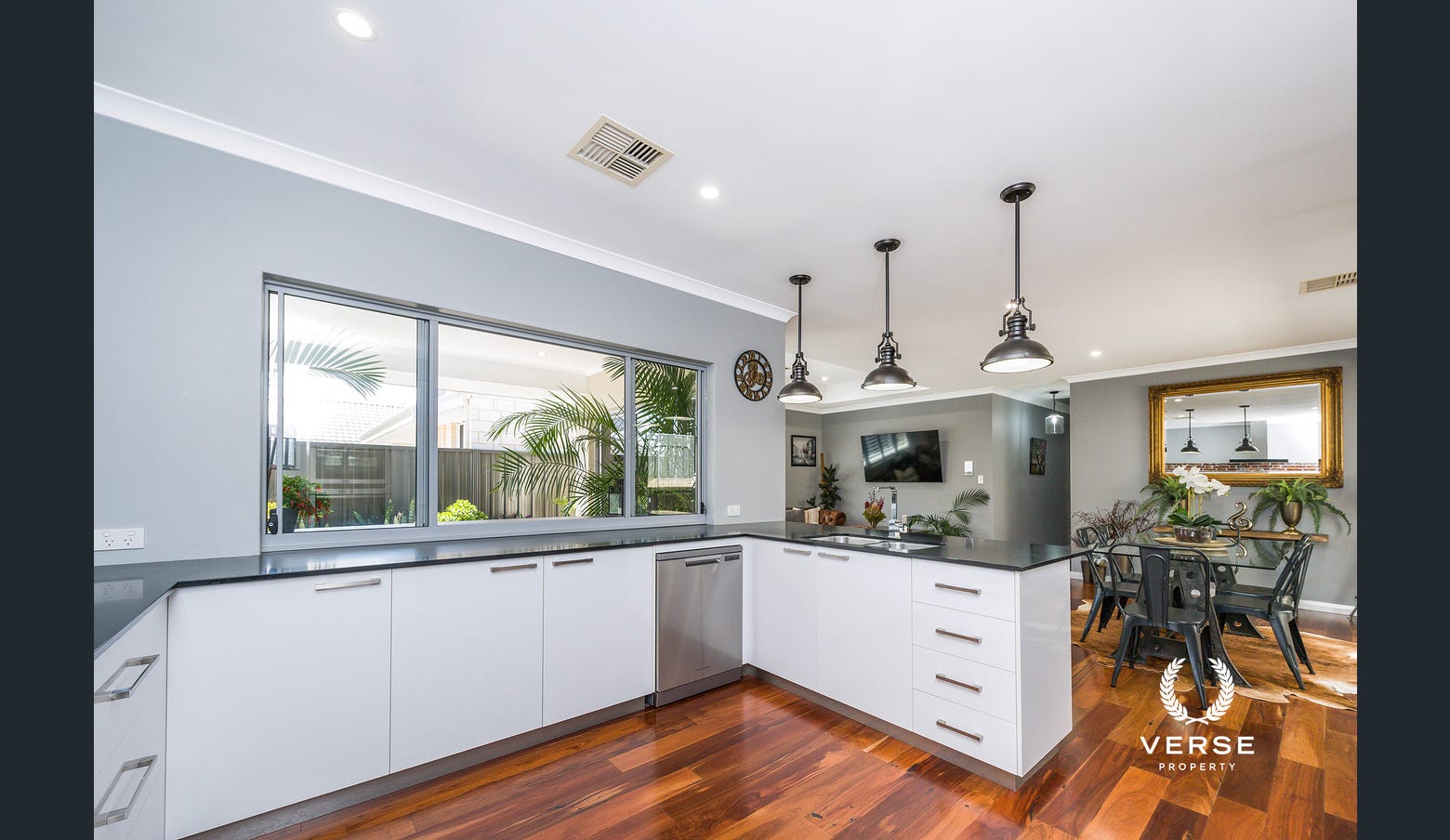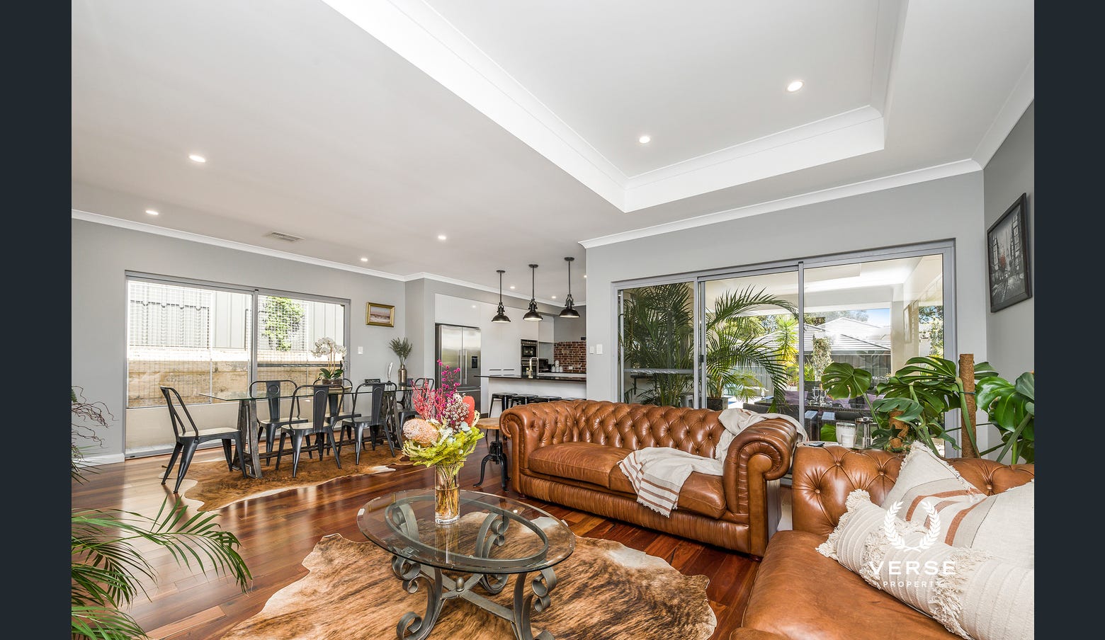 Living: Step inside to a welcoming entryway, where heavenly solid jarrah flooring and ambient downlighting set the tone for the sophisticated interiors. The heart of the home is the expansive open-plan living, with high ceilings and sunlit windows creating an inviting and airy atmosphere.
