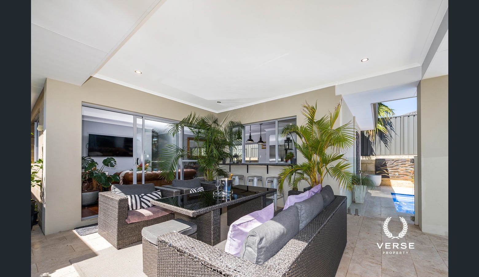 Outdoor Entertaining: The resort-style pool features a waterfall, automatic system, filtered lighting, and glass fencing for safety and style. The expansive alfresco area is Perfect for outdoor dining and relaxation, complete with a butler window from the kitchen. Low-maintenance landscaping,water-wise gardens, and thoughtfully designed grounds allow you to enjoy the outdoors without the hassle of heavy upkeep.