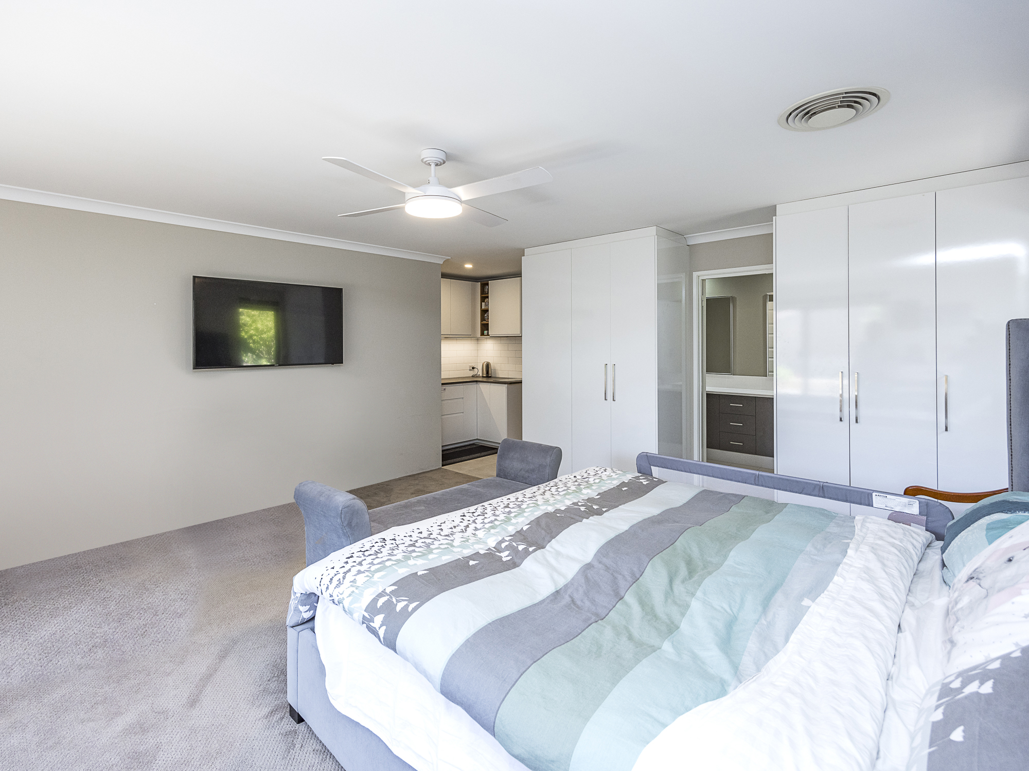 Beyond a gated front-yard entrance and cedar ceiling portico lies a tiled fourth bedroom – or potential home office – that can be whatever you want it to be, boasting a ceiling fan and full-height built-in wardrobes. A spacious and carpeted master-bedroom suite near here has a ceiling fan, separate “his and hers” built-in robes and its own built-in kitchenette with a fridge, sink, storage, subway-tile splashbacks, an Artusi electric cooktop and a separate oven, making it the ultimate parents' retreat or secure granny flat.