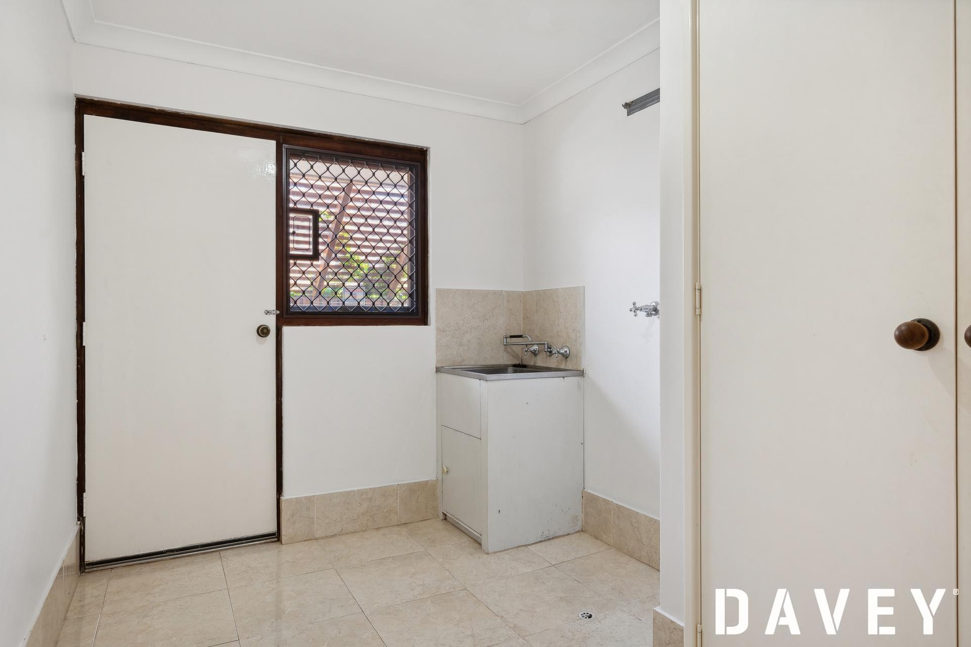 Practical laundry with a double linen/broom cupboard and external/side access
