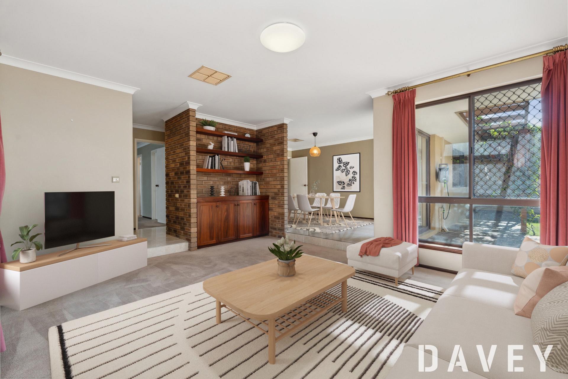 The potential to add further personal modern touches to existing renovations should not be underestimated either, as you embrace a functional floor plan with multiple living options. Inside, a sunken and carpeted front lounge room is charmed by original brickwork and has built-in timber storage and shelving, overlooked by a tiled formal dining room that is also reserved for those special occasions.