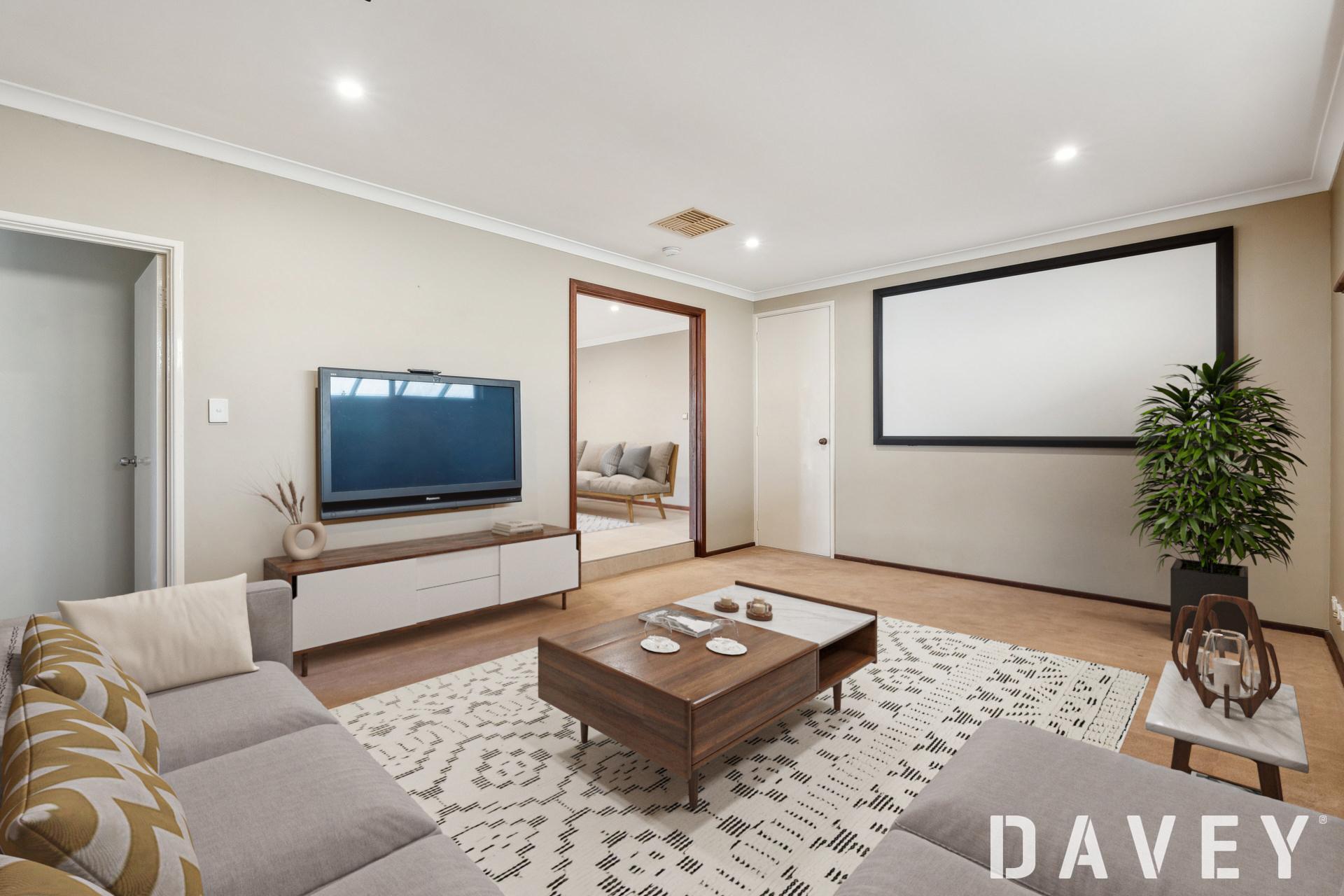 A large sunken games heatre room is fully-equipped with a projector and movie-style screen on the wall, along with a storage cupboard. Off here, a spacious carpeted fourth or "guest" bedroom is the perfect teenager's retreat with its own split-system air-conditioning unit, walk-in wardrobe and built-in wall-to-wall kitchenette - with a stone bench top, sink and storage.