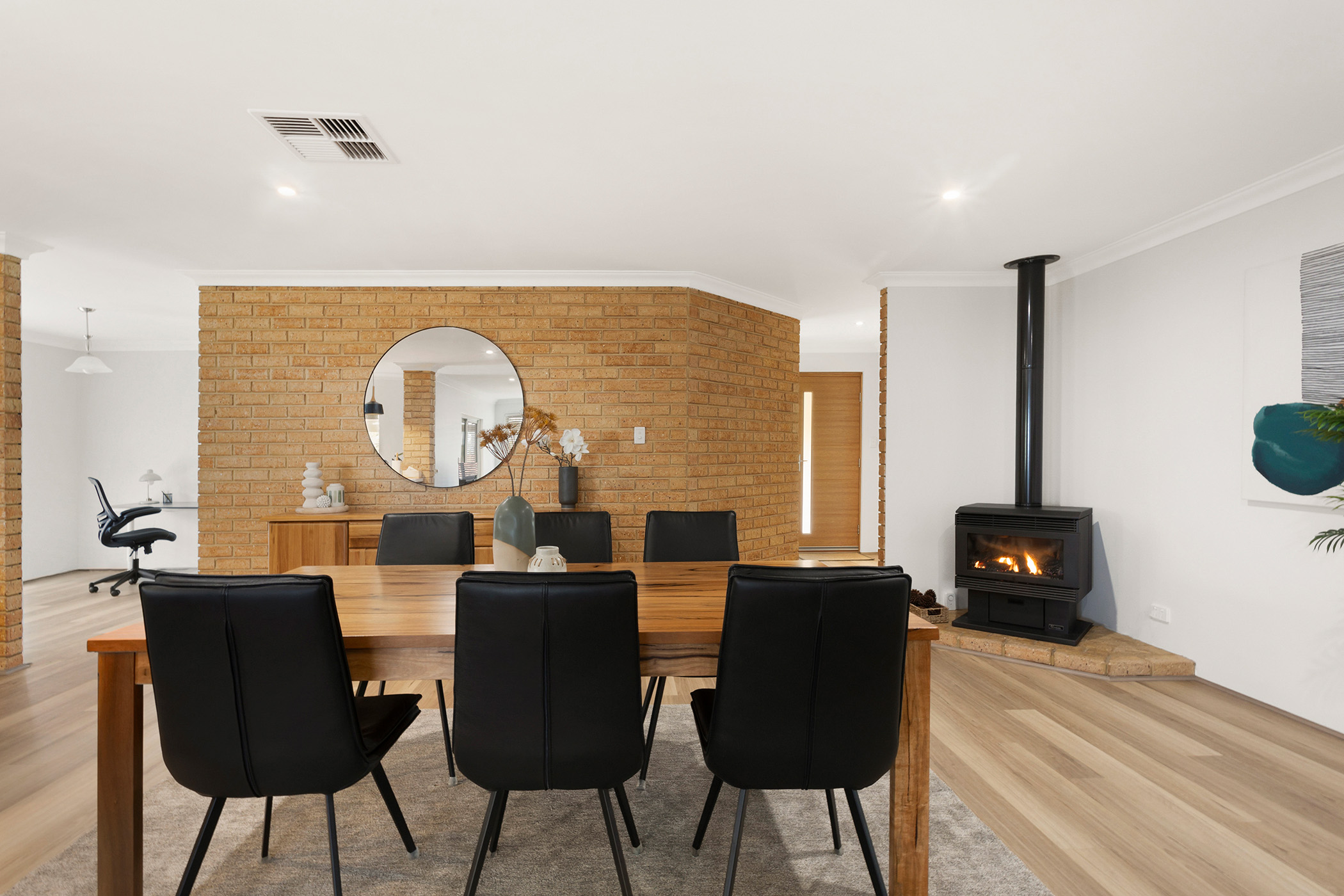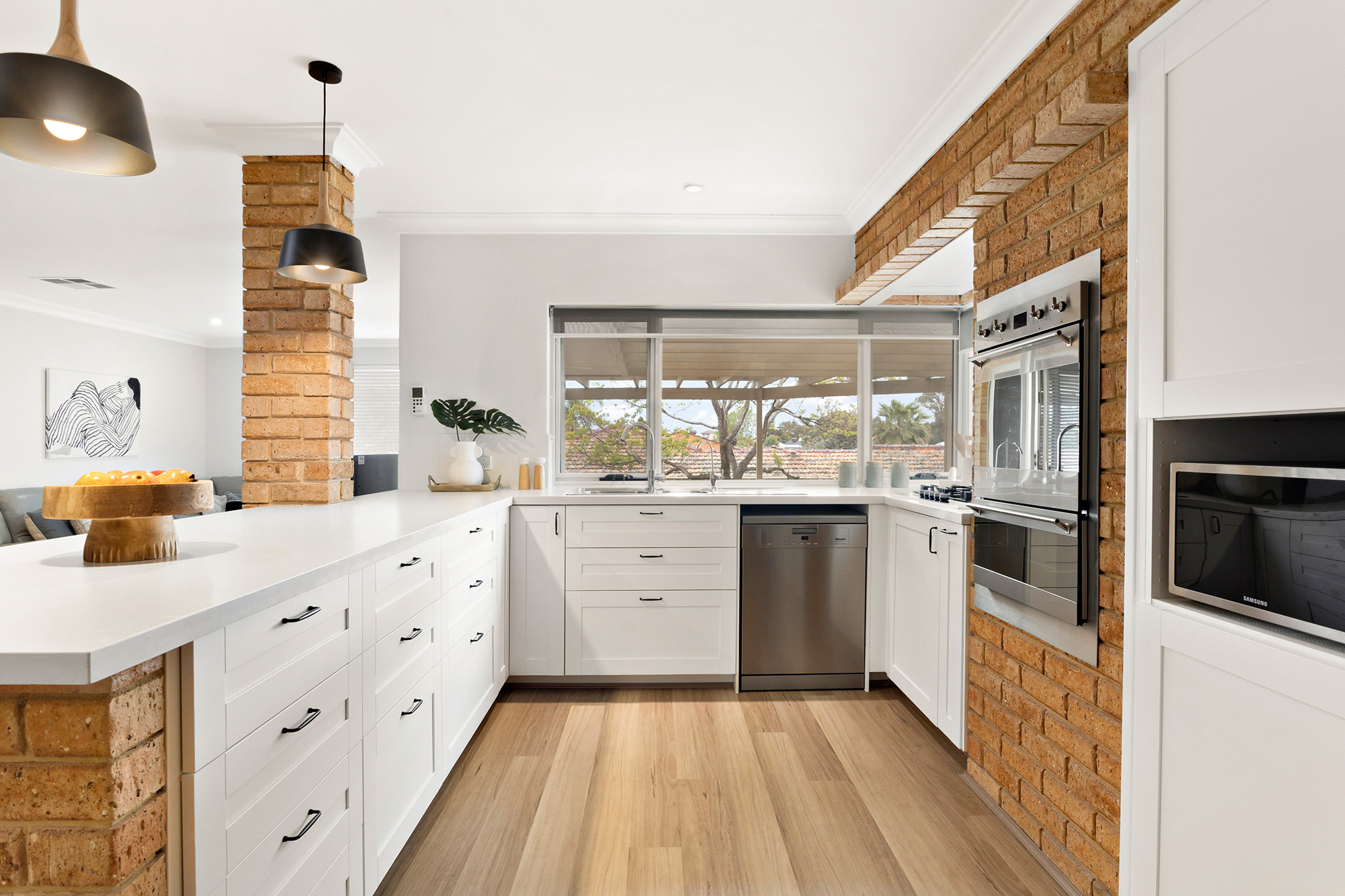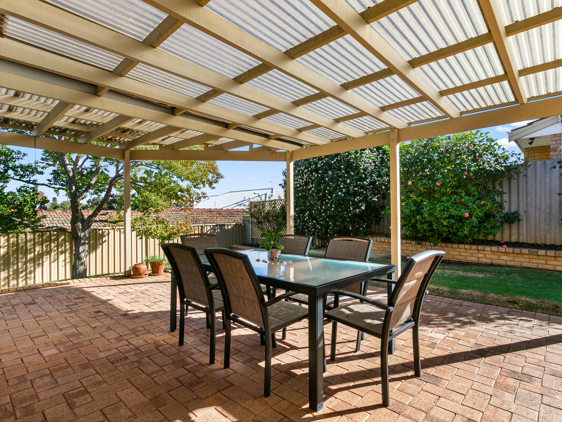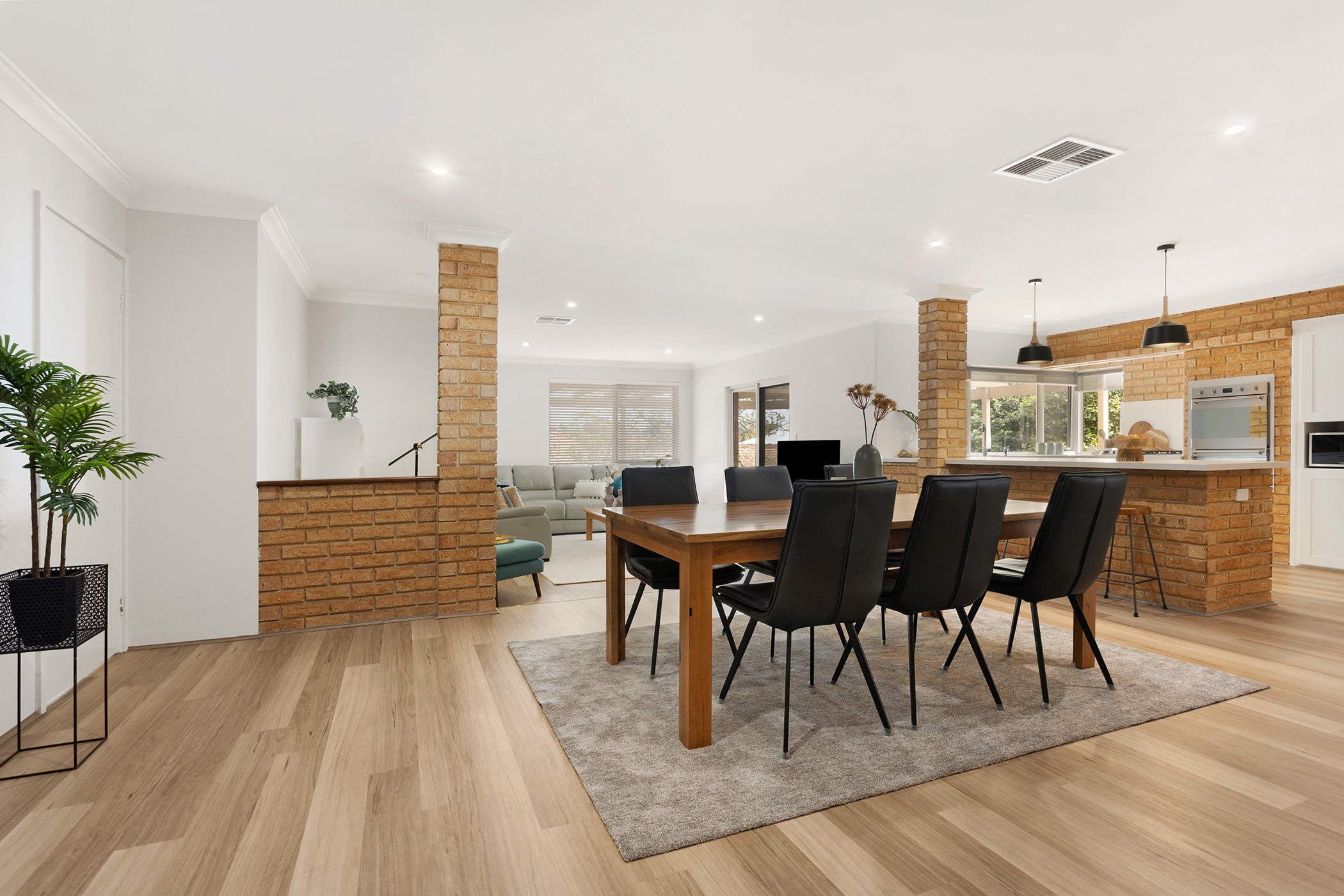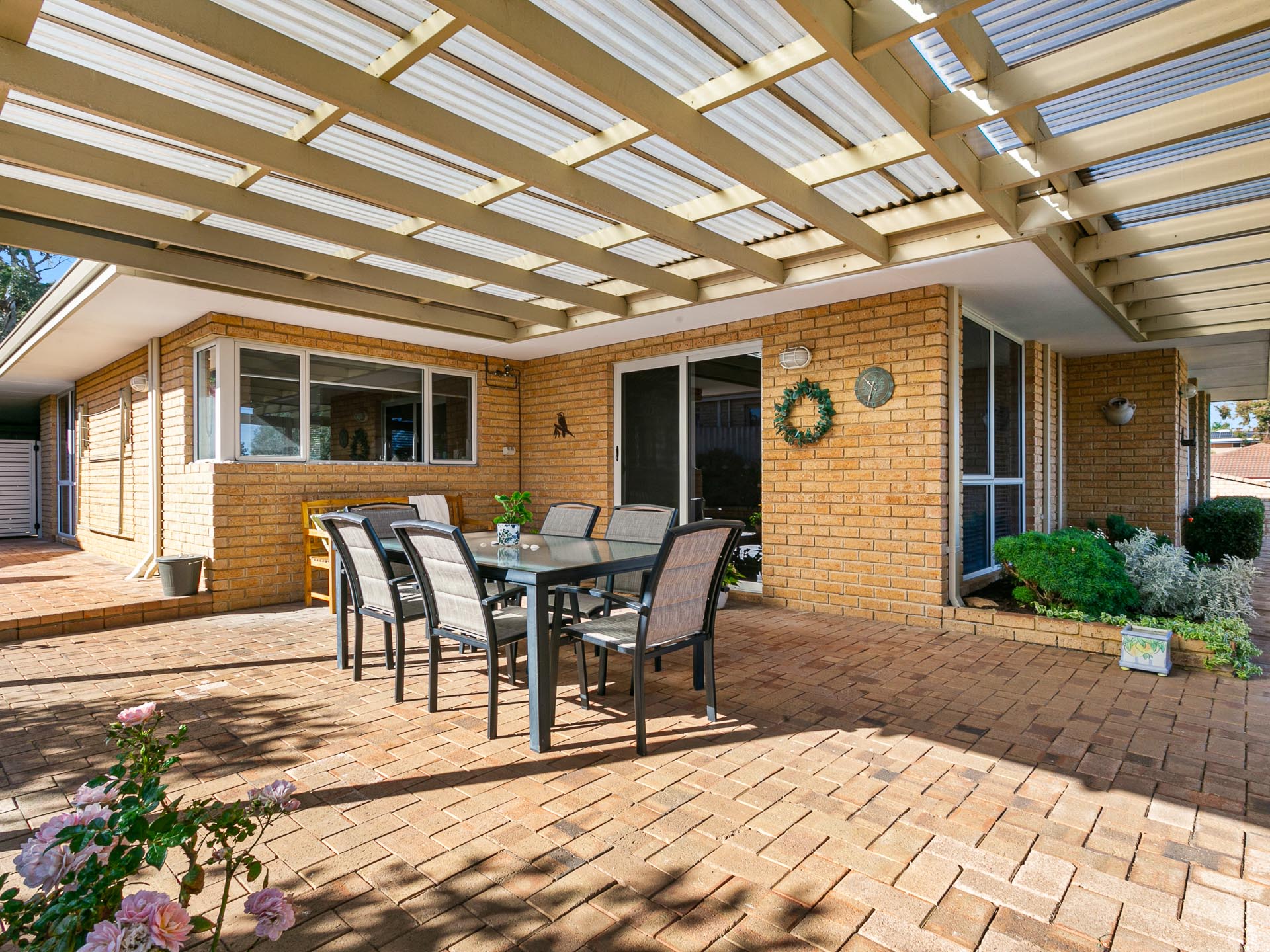 The kitchen strikes the perfect balance between classic charm and modern functionality with its warm brick accents, modern lighting, and stainless steel appliances. Adjacent to the dining area, this space becomes the perfect setting for shared meals and lively conversations. Sliding doors lead to the covered alfresco, extending the living space outdoors and offering a picturesque spot for year-round entertaining. Whether it's a casual barbecue or a quiet evening meal, this home caters to both indoor and outdoor living with ease.