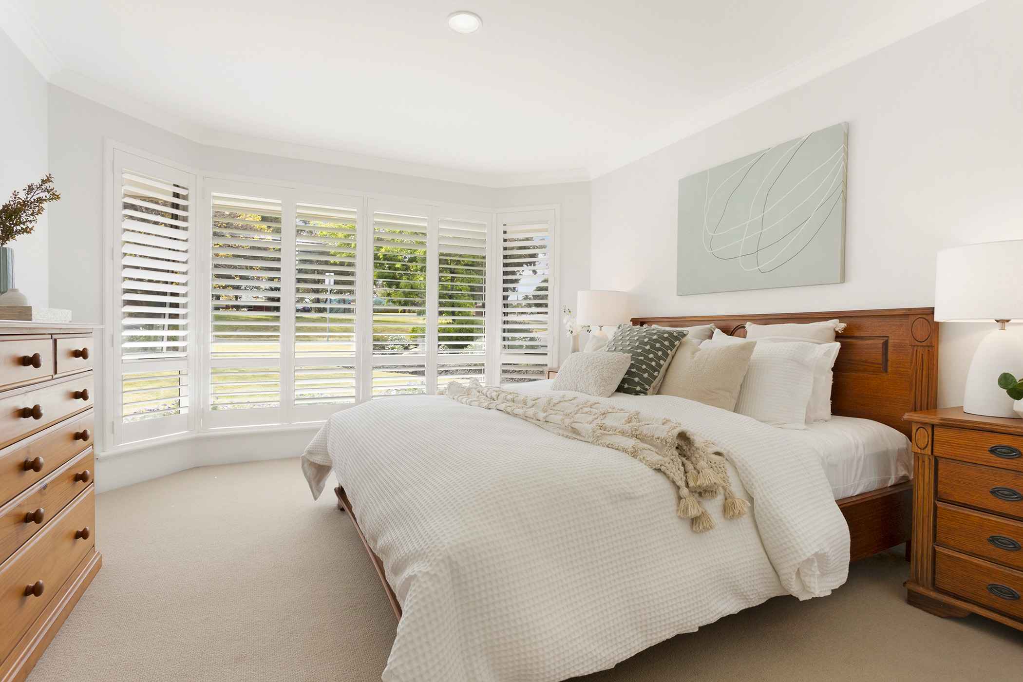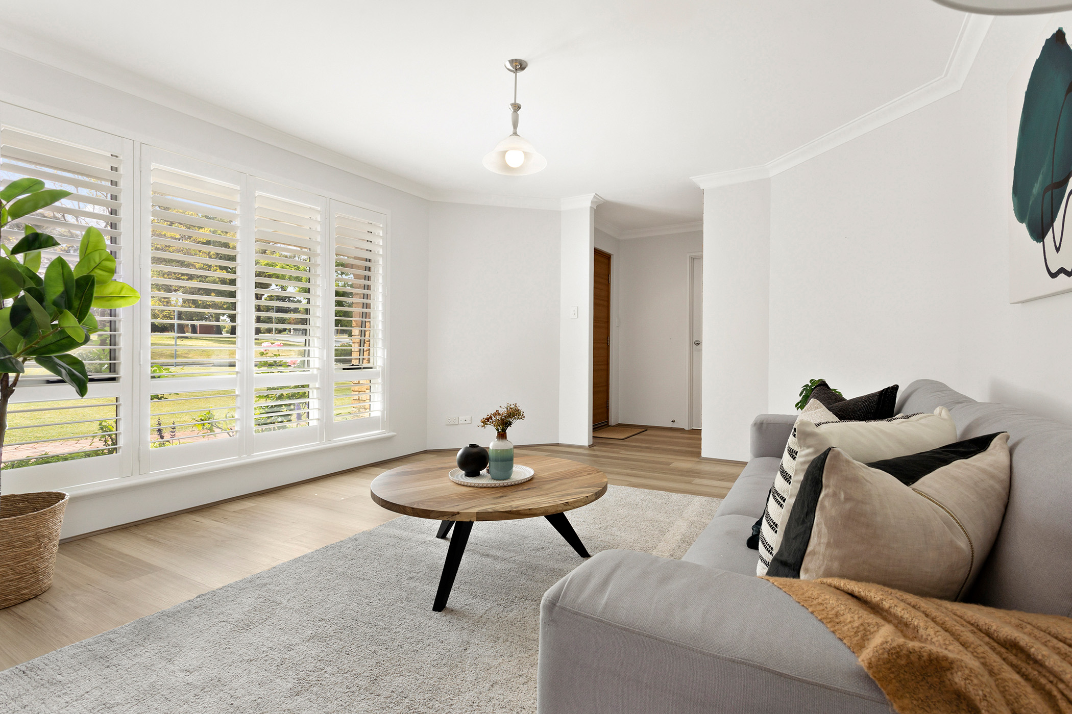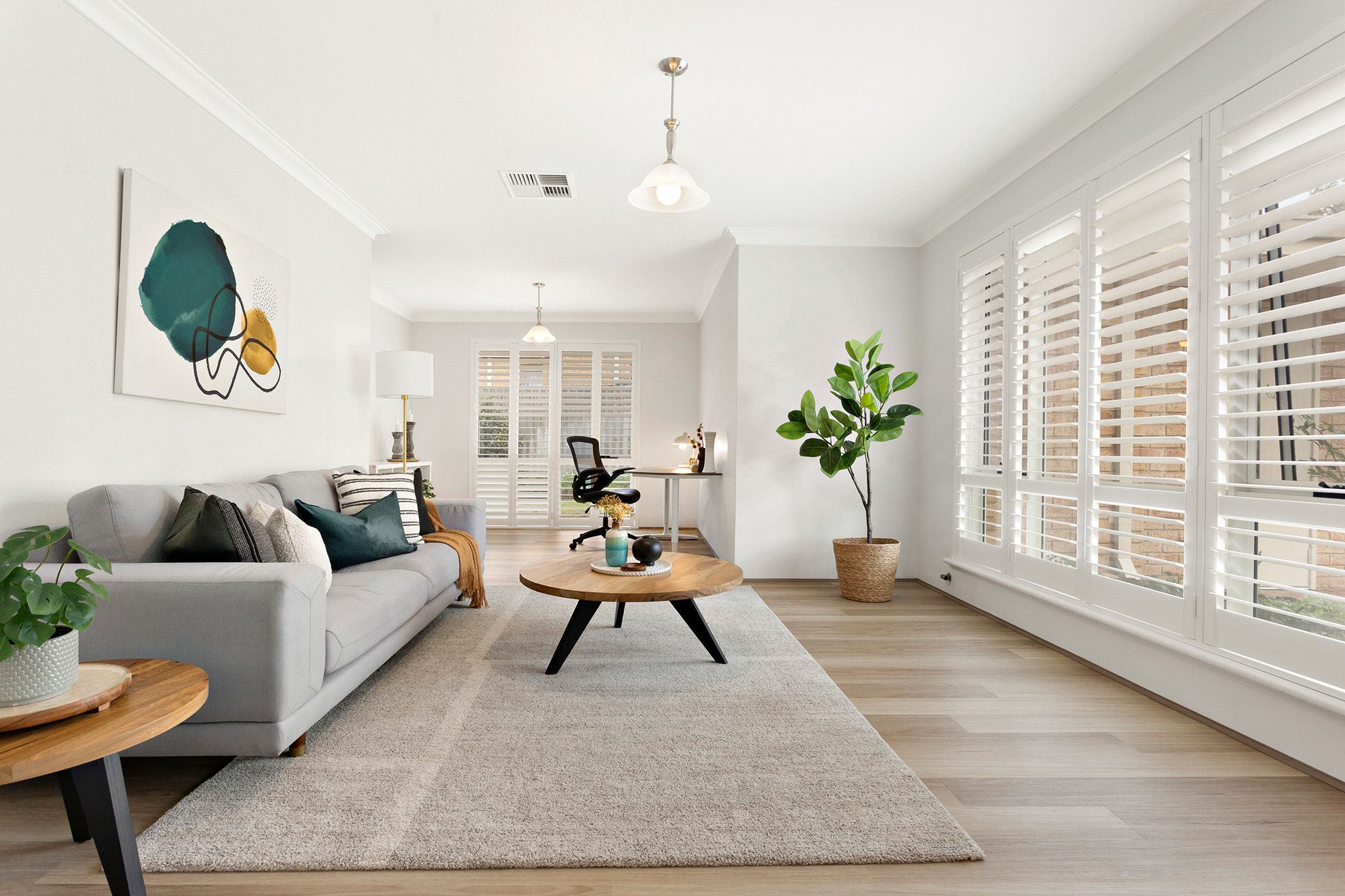 Inside, the home boasts spacious living areas bathed in natural light, showcasing a modern open-plan layout that flows seamlessly from room to room. A neutral colour palette creates a calming atmosphere, while large windows adorned with white plantation shutters provide serene views of the surrounding greenery. The formal lounge offers a cosy space to unwind, setting the tone for the rest of the home's well-thought-out design. The heart of the home is the open living and dining area, which connects effortlessly to the contemporary kitchen, making it ideal for family gatherings and entertaining.