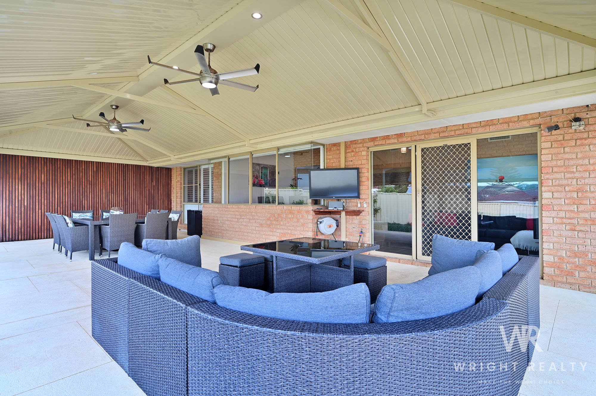 - Step outside via the games room into a fantastic entertainer's delight! A vast patio area with timber feature wall, ceiling fans and café style blinds provides an exceptional space for year-round entertainment.