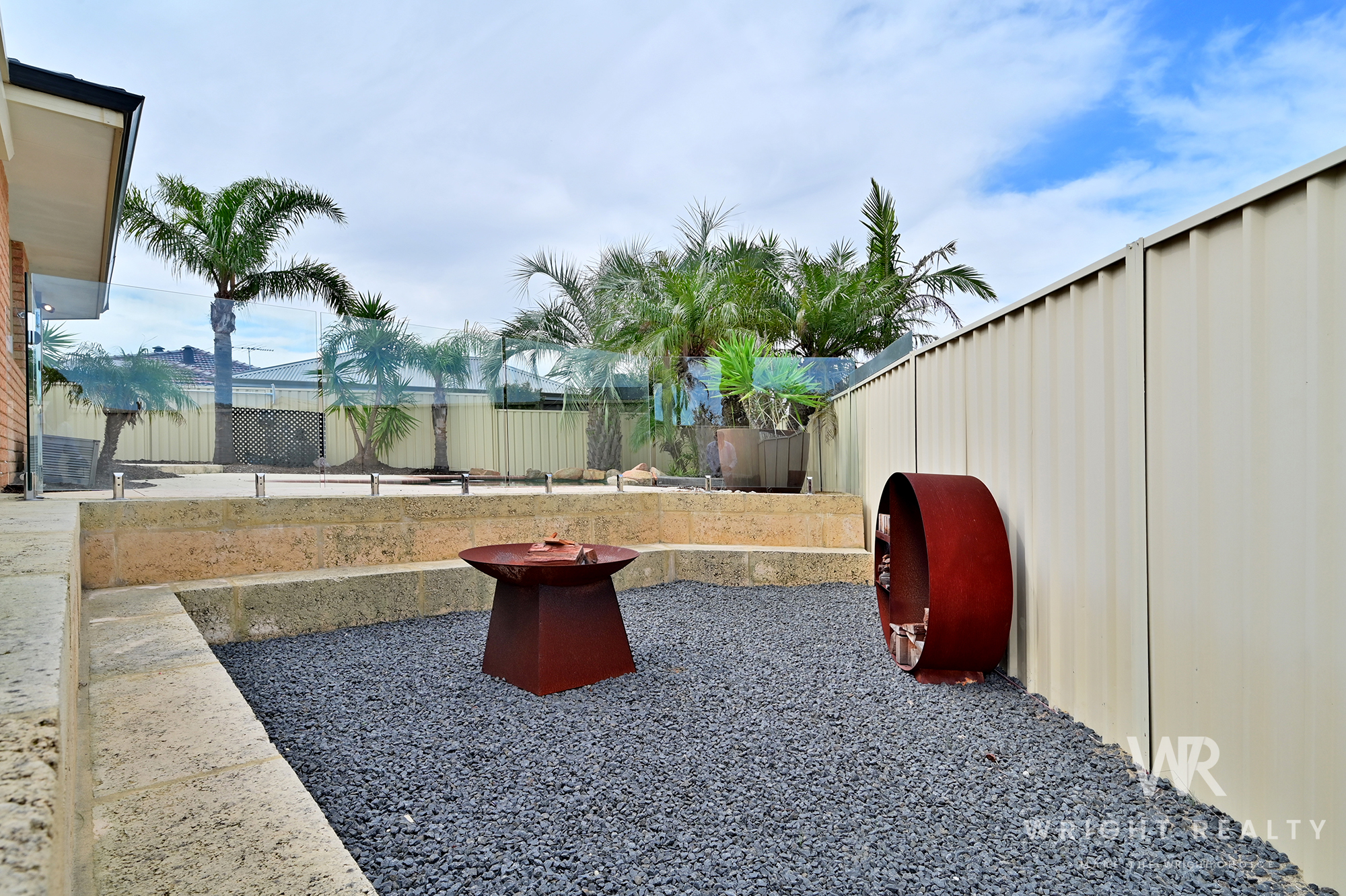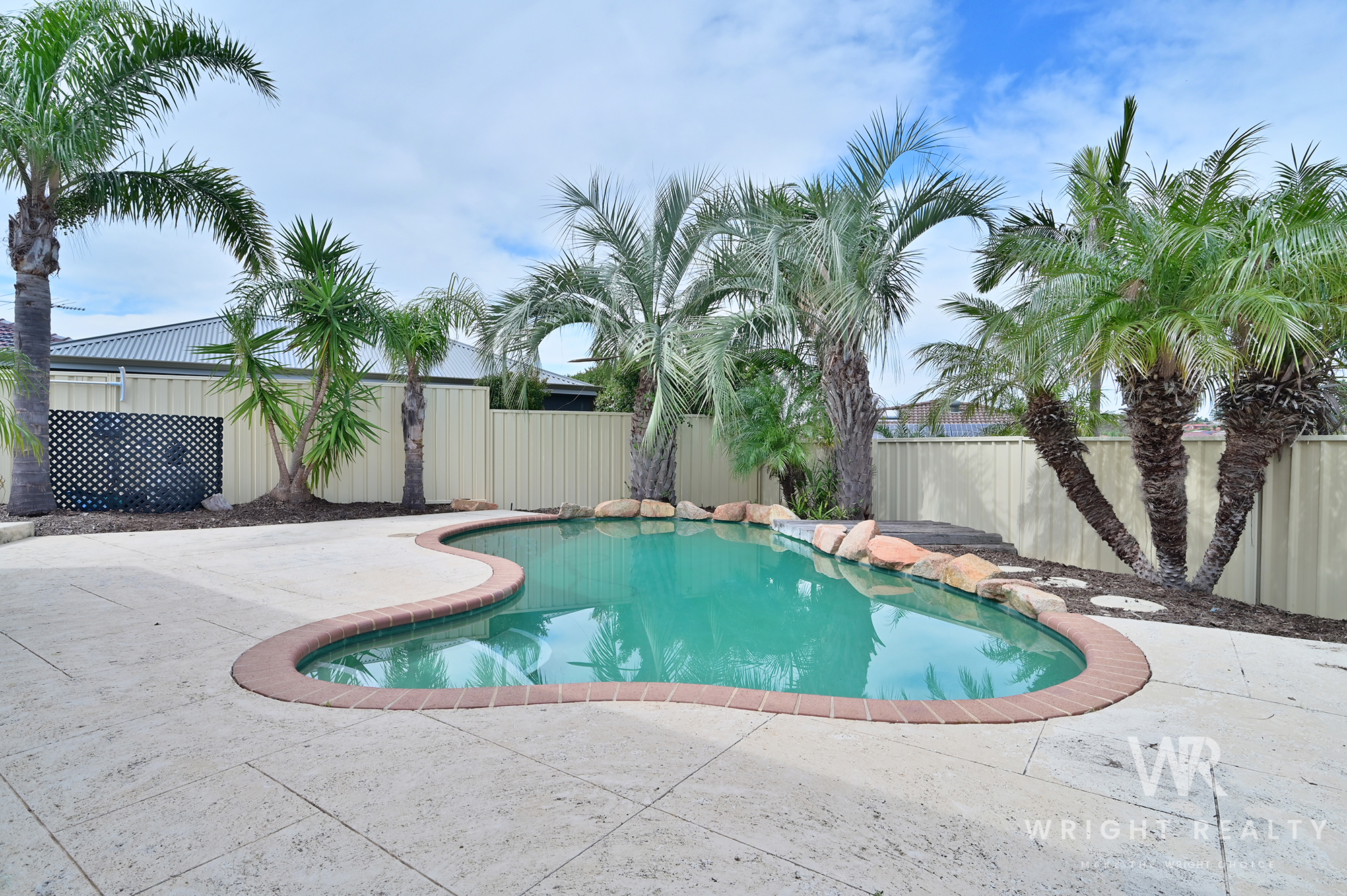 - Through the glass fence, your oasis awaits. A lovely pool area with rockery, liquid limestone and palms provides a fantastic space to enjoy your resort style setting.