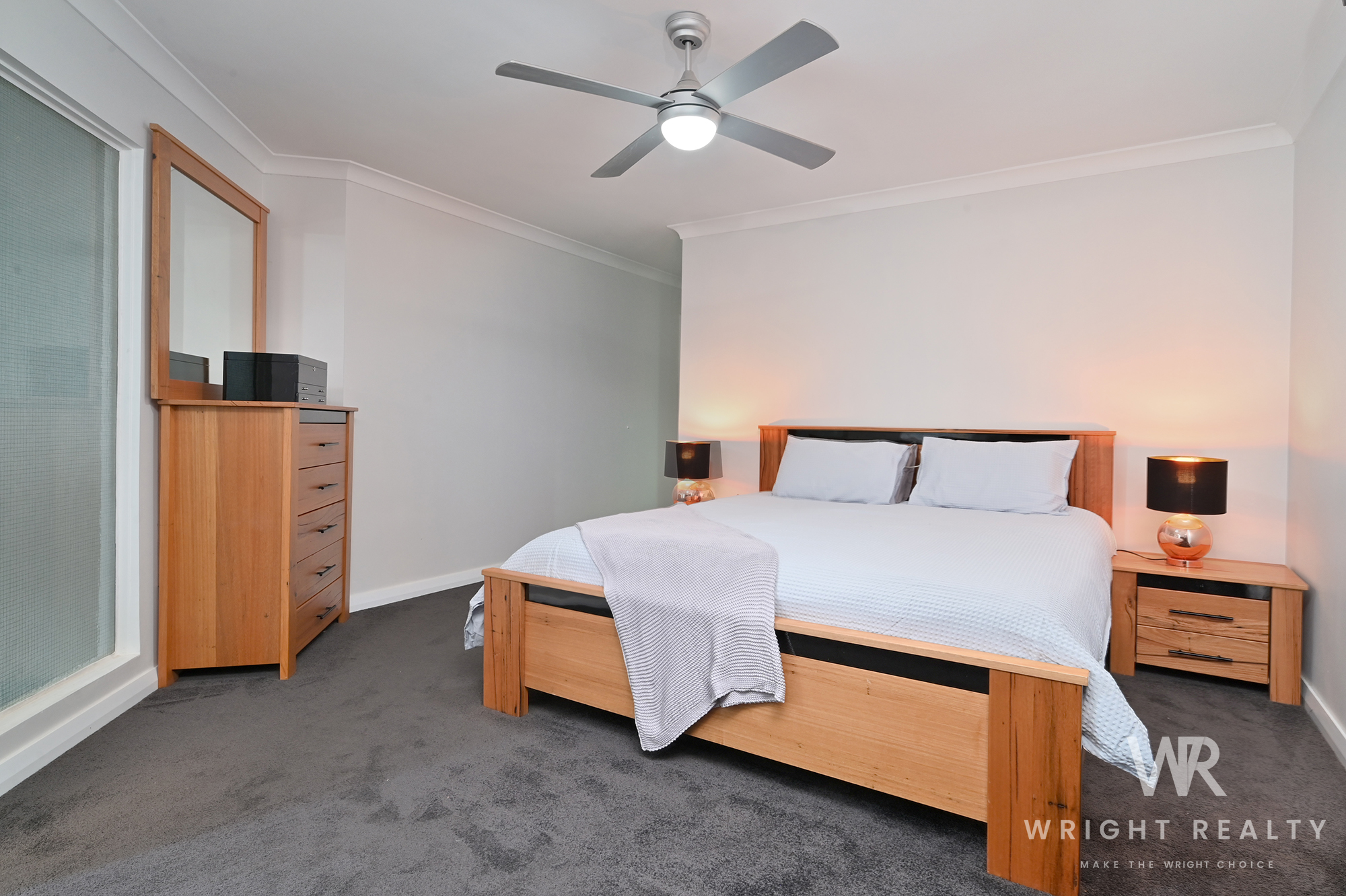 - To the left of the home are the bedrooms. The spacious main bedroom features grey plush carpet, ceiling fan, a good-sized walk-in wardrobe with built-in cabinetry and ensuite bathroom.